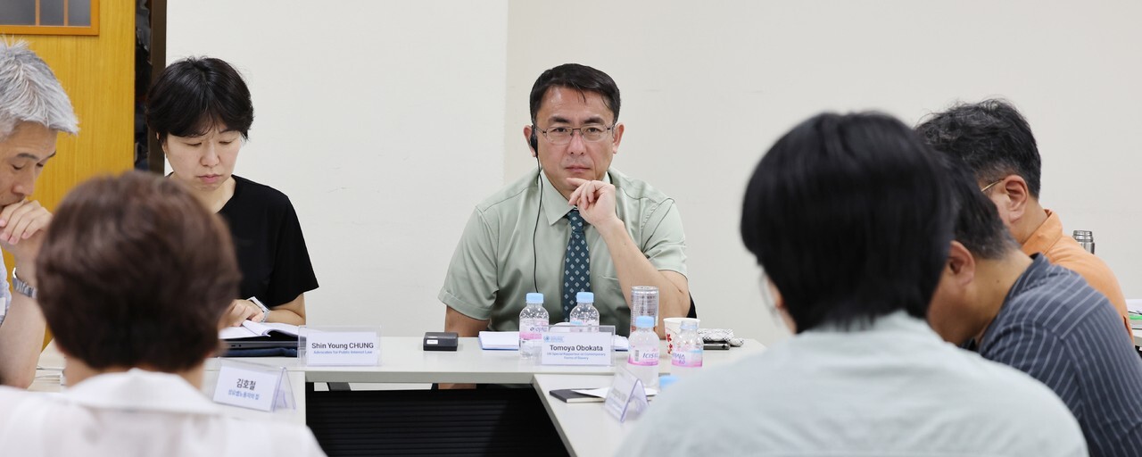오보카타 도모야 유엔 ‘현대판 노예제’ 특별보고관(왼쪽 뒷줄 셋째)이 2025년 7월4일 서울 중구 국가인권위원회에서 열린 ‘이주정책 포럼'에 참석해 이주단체 활동가들의 이야기를 듣고 있다. 신소영 기자 viator@hani.co.kr