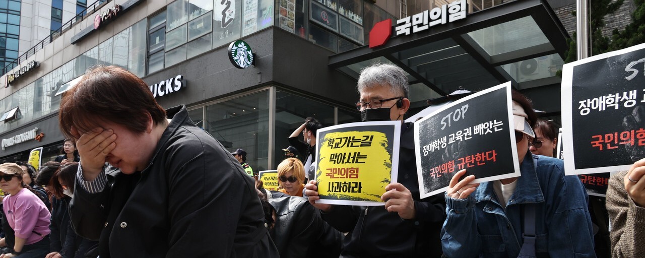 무릎을 꿇은 전국장애인부모연대 서울지부 회원들이 2024년 4월4일 오전 서울 여의도 국민의힘 당사 앞에서 서울 성동구 성수공고 부지에 추진 중인 특수학교 설립 대신 특수목적고 설립을 공약으로 내놓은 국민의힘 서울 중·성동갑 윤희숙 후보에게 공약 철회와 사과를 요구하고 있다. 한겨레 윤운식 선임기자 yws@hani.co.kr