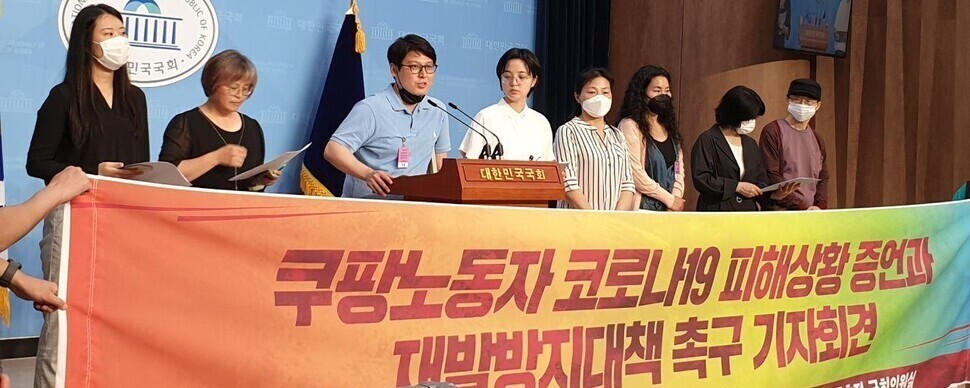 2020년 6월18일 국회 소통관에서 ‘쿠팡발 코로나19 피해 노동자 모임’ 고건 대표가 코로나19에 미흡하게 대응한 쿠팡의 책임을 지적하고 있다. 한겨레 전광준 기자 light@hani.co.kr