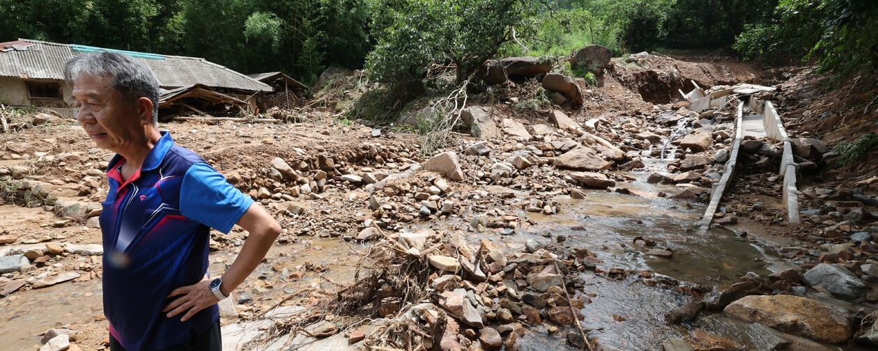 2025년 7월19일 내린 ‘극한 호우’로 침수 피해를 입은 경남 산청군 산청읍 병정리 가촌마을에서 7월21일 한 주민이 폐허가 된 집터를 바라보고 있다. 한겨레 김태형 기자