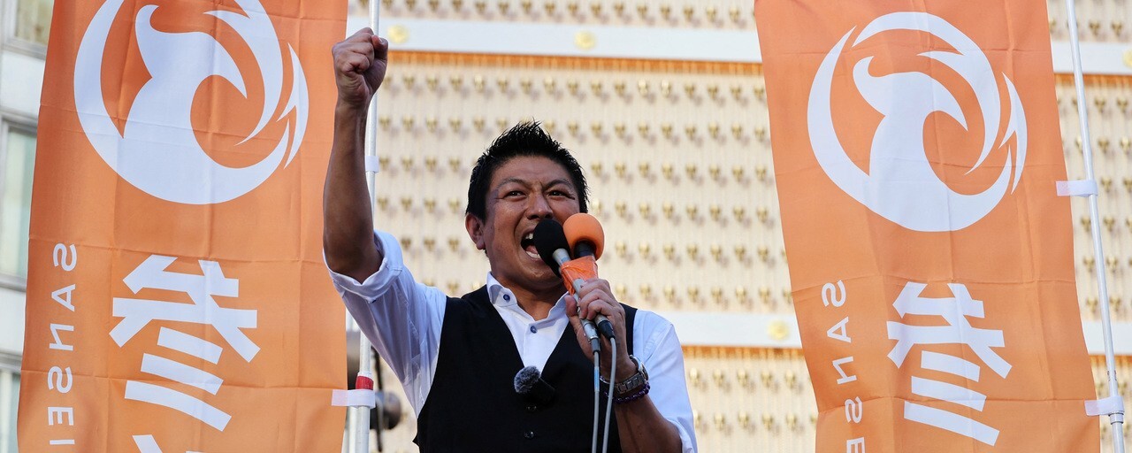 2025년 7월21일 일본 도쿄에서 열린 참정당 집회에서 가미야 소헤이 참정당 대표가 연설하고 있다. 전날 참의원 선거에서 참정당은 세를 크게 늘렸다. REUTERS