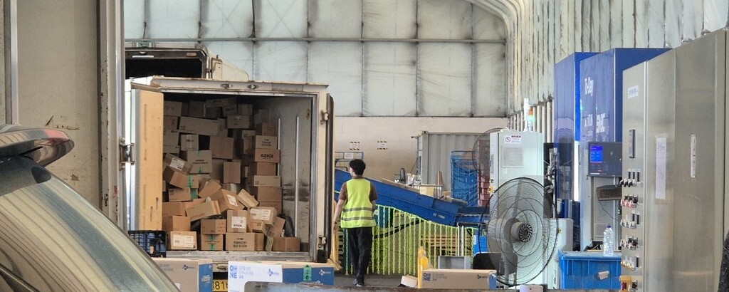 2025년 7월22일 서울의 한 분류터미널에서 기사들이 ‘1회전’ 배송 물량이 나오기를 기다리고 있다. 터미널 내부 온도는 32.5도, 습도는 70%였다. 신다은 기자
