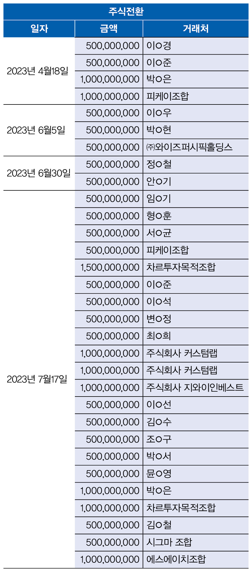 이렇게 최종 주인들에게 간 주식 규모가 205억원(시세 반영시 400억~800억원)이다. 최종 주식 수령자로 등재된 이들은 주식을 5억~15억원 수준으로 잘게 나눠 가졌다. 한 자본시장 전문가는 “주식 전환자가 금액을 10억원 안쪽으로 분배해서 가져갔고, 중간 거래상으로 와이즈를 집어넣는 등 거래 구조가 복잡하다. 이로 인해 실제 이득을 본 사람을 찾기 어려운 구조가 된 것”이라고 분석했다. 언급한 인물 외에 10명 안팎의 인물과 조합이 적게는 각자 수십억원에서 많게는 100억원 안팎의 차익을 봤을 수 있다.