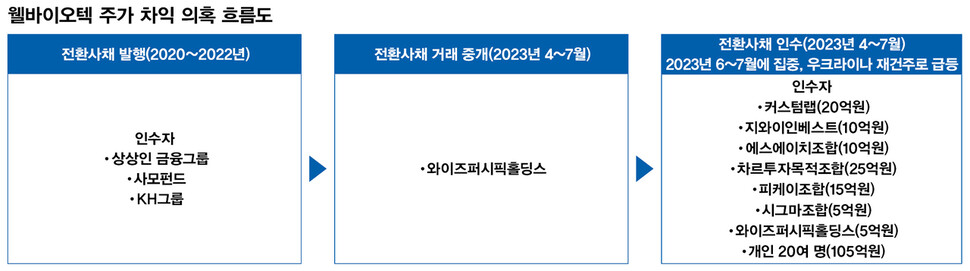 이렇게 우크라이나 재건주 급등 시기에 차익을 봤을 것으로 추정되는 웰바이오텍의 전환사채는 2020~2022년 발행분이다. 전환사채 발행 당시 상상인 금융그룹, 사모펀드, 케이에이치그룹 등이 들고 있다가, 복잡한 손바뀜과 와이즈를 거쳐 ‘대박’을 누릴 수 있게 최종 주인에게 전달됐다. 웰바이오텍은 자신들의 회사를 기반으로 특정인에게 주식 대박의 기회를 열어준 셈이다. 결국 특검 수사는 이 특정인을 밝혀내는 데 사활이 걸렸다.