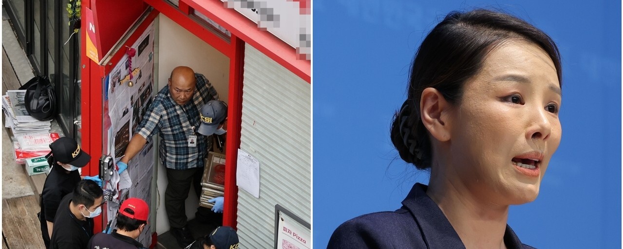2025년 9월3일 살인 사건이 발생한 서울 관악구의 한 프랜차이즈 피자 가게에서 경찰관들이 조사를 하고 있다.(왼쪽 사진) 조국혁신당 강미정 대변인이 2025년 9월4일 국회에서 당내 성비위 의혹과 관련한 탈당 기자회견을 하고 있다. 연합뉴스