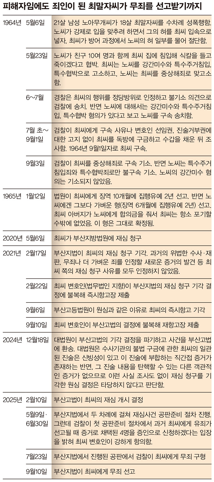 이후 부산고법의 재심 개시 결정으로 부산지법에서 재심사건 공판이 진행됐고, 검찰은 2025년 7월23일 최씨에게 무죄를 구형했다. 그로부터 한 달 반이 지난 9월10일, 최씨는 마침내 무죄를 선고받았다. 60년. 최씨가 잘못된 판결을 바로잡기까지 흐른 세월이다. 피해 발생일을 기준으로 하면 최씨가 억울함을 푸는 첫걸음을 떼기까지 무려 61년이 걸렸다.