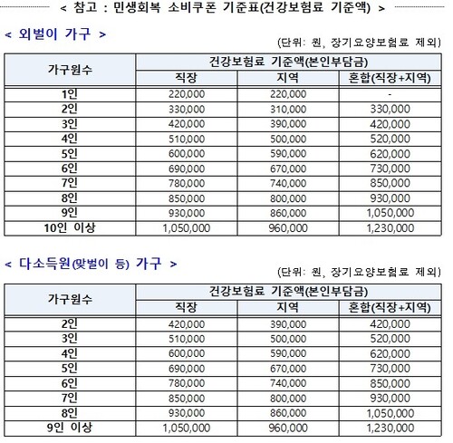 홀벌이 직장가입자 기준으로 1인 가구는 건보료 본인부담금 22만원 2인 가구는 33만원, 3인 가구는 42만원, 4인 가구 51만원, 5인 가구 60만원 이하면 소속 가구원이 모두 각 10만원을 받을 수 있다.