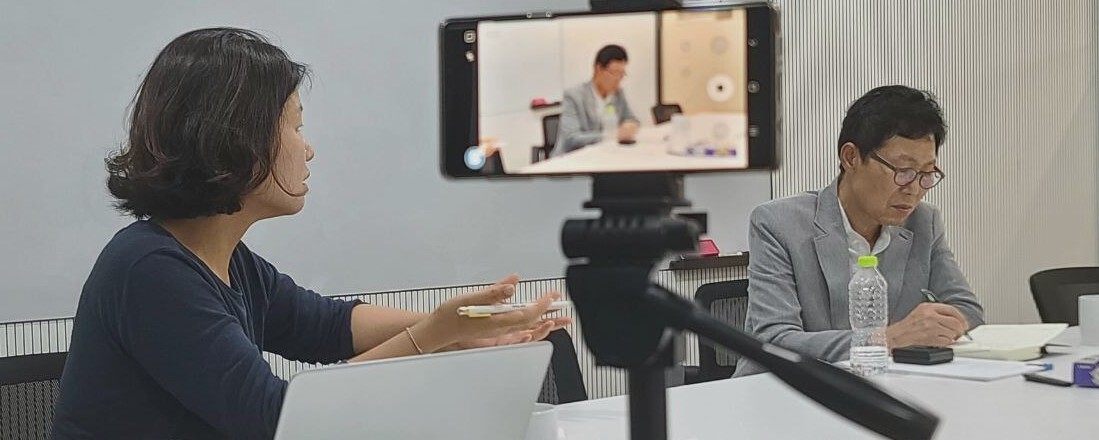 석미화 아카이브평화기억 대표(왼쪽)가 2023년 7월13일 오경열 참전군인과 공익활동공간 서울 삼각지 회의실에서 만나 그의 전쟁 경험을 듣고 있다. 석미화 제공