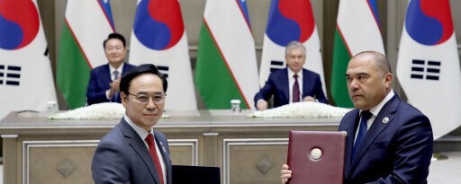 우즈베키스탄 대통령궁에서 2024년 6월14일(현지시각) 열린 양해각서(MOU) 서명식에서 이용배 현대로템 사장(왼쪽)과 우즈베키스탄 철도공사 사장이 ‘우즈베키스탄 철도공사 고속철 6편성 공급계약’에 서명한 뒤 기념사진을 찍고 있다. 대통령실사진기자단