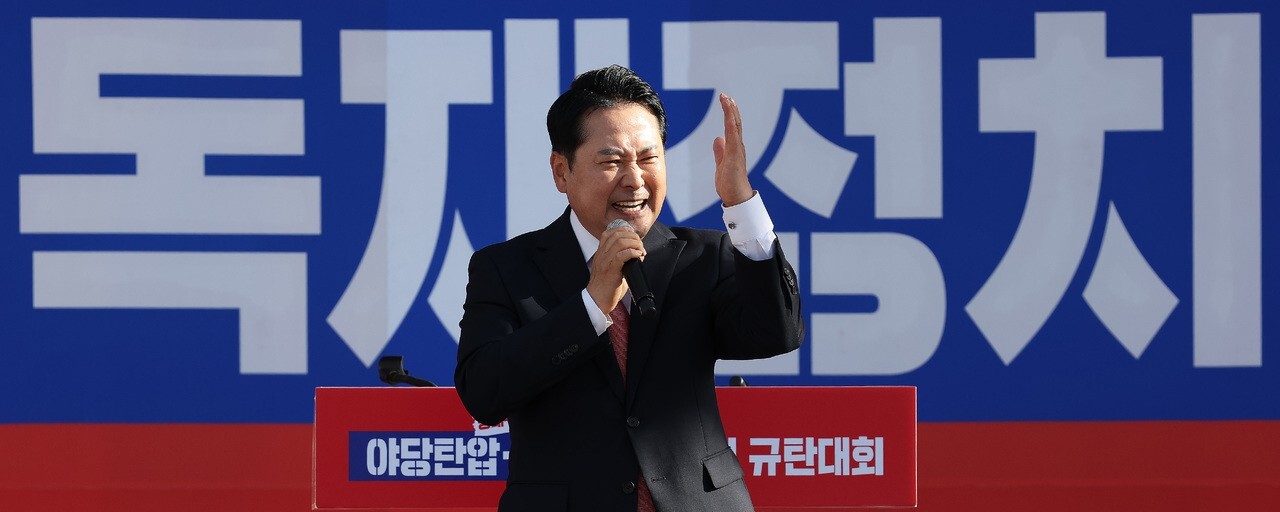 장동혁 국민의힘 대표가 2025년 9월21일 대구 동대구역 광장에서 열린 ‘야당탄압·독재정치 국민 규탄대회'에서 연설하고 있다. 연합뉴스