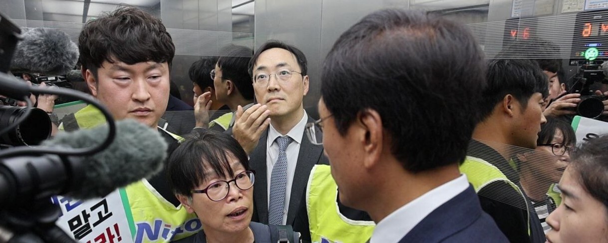 건물 앞이 소란스럽다. 서둘러 떠나려는 이배원 니토옵티칼 대표이사를 해고 노동자들이 붙잡았다 . 3년 만의 첫 만남이었다. 노동자들이 하루종일 경기도 평택 공장 앞을 지켜도, 600일을 불탄 경북 구미 공장 옥상에서 농성해도 만날 수 없던 사람이다. 그 사람이 2025년 10월15일 국회 기후정의환경노동위원회 국정감사에서 증인으로 처음 모습을 드러냈다.