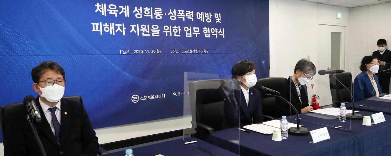 2020년 11월30일 서울 서대문구 스포츠윤리센터에서 열린 ‘체육계 성희롱·성폭력 예방 및 피해자 지원을 위한 업무 협약식'. 전문가들은 스포츠윤리센터가 출범 5년이 되도록 스포츠인이나 사회로부터 전문성과 신뢰성 등을 인정받지 못하고 있다고 지적한다. 연합뉴스