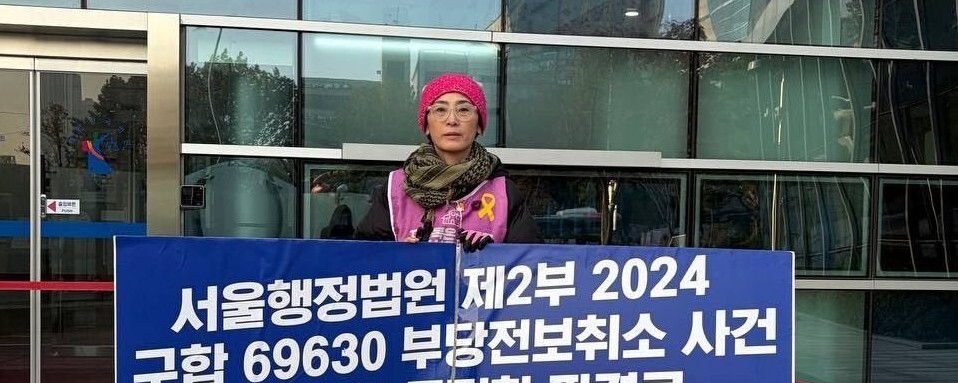 2025년 11월6일 지혜복 교사가 서울 서초구 서울행정법원 앞에서 재판부의 공정한 판결을 촉구하고 있다. A학교 성폭력사안·교과운영 부조리 공익제보교사 부당전보철회 공대위 제공