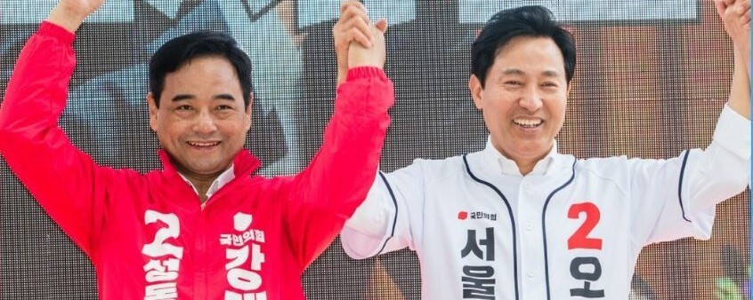 2022년 6·1 지방선거를 앞둔 5월31일 국민의힘 서울 성동구청장 후보로 출마한 강맹훈 전 서울시 도시재생실장과 오세훈 서울시장이 합동유세를 하고 있다. 강맹훈 전 실장 인스타그램 갈무리