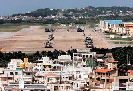 오키나와에서 미군기지 하면 제일 먼저 떠오르는 게 후텐마 기지다. 면적으로만 따지면 가데나 공군기지가 더 크지만, 후텐마 기지는 도심의 한가운데에 위치해 있어 사고와 민원이 끊이지 않았다. 후텐마 기지는 오키나와의 중심지인 나하에서 약 10km 북쪽에 위치한 기노완시 한가운데에 자리잡고 있다. 알토란 같은 시 중심을 모두 미군기지가 잠식한 것이다. 후텐마 기지는 미 해병대의 전진기지로 전투기·군용기·헬기 등 공격적인 항공장비가 집중돼 있다.