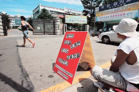 이용석 교사는 징계위의 결정이 알려진 8월7일부터 다시 경기도교육청 앞으로 가 1인 시위를 시작했다. 섭씨 34도에 이르는 무더위. 이날 오전 이 교사는 혼자 아스팔트의 후끈한 열기를 버티며 쪼그려 앉아 책을 보고 있었다. 징계위가 정직 3개월을 교육감에게 요구했고, 이젠 요식적인 절차만 남은 것처럼 보였다.