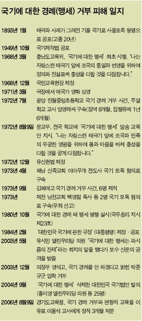 박정희 유신정권이 시작될 무렵인 1972년 전남 광양 오사교회의 주일학교 교사인 양영례씨는 아이들에게 경례 거부를 시켰다며 징역 8개월(집행유예 1년6개월)을 선고받았다. 보석으로 나오기까지 양씨는 한 달여의 구치소 생활을 했다. 1973년 국기 경례를 하지 않은 김해여고 학생 6명은 퇴학을 당했다. 대법원은 “종교의 자유는 학칙과 교내 질서를 해치지 않는 범위 내에서 보장된다”며 일개 학칙이 헌법상의 종교와 양심의 자유보다 상위에 있다는 놀라운 판결로 화답했다. 지금은 사법고시 교과서에 나오는, 고시생들이 코웃음을 치며 드는 ‘유신 사법부’의 대표적인 판결이다. 이뿐이었을까. 학교 현장의 다양성은 꾸준히 묵살됐다. 불과 3년 전, 박준규군은 고입 면접 전형서에 “종교적 신념상 국기 경례를 하지 않으니 양해해달라”고 썼다가 의정부 영석고에서 입학을 거부당했다. 경기도교육청은 그때도 “영석고의 입학 거부는 정당한 학생 선발권의 행사”라고 화답했다. 일개 학교의 학생 선발권이 종교와 양심·사상의 자유보다 중요하다고 ‘행정 조처’한 것이다. 그래서 이용석 교사의 징계가 새삼스럽지 않다. 적어도 이번 징계는 1972년 박정희 유신정권 때 대대적으로 취해진 ‘국기 경례 거부 사범’의 색출과 처분이라는 법적·행정적 일관성이 34년 동안 지켜져오고 있음을 보여준다.