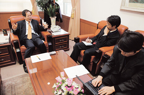 천영우 외교통상부 평화교섭본부장(6자회담 남쪽 수석대표)의 얼굴에선 여유가 느껴졌다. “북한이 핵 폐기까지 나갈 의지가 없었다면 이번과 같은 내용에 합의하지는 않았을 것”이란 믿음 때문이다. 그는 “이번 합의는 비핵화란 긴 여정에서 첫걸음을 내딘 것이며, 아직 갈 길이 멀고 험하다”면서도 “초기 조치 이행이 끝나기 전에 모든 핵무기와 핵 프로그램의 완전한 폐기까지 가는 이행계획을 한꺼번에 합의하는 게 목표”라고 밝혔다. 2월21일 오후 외교통상부 18층 집무실에서 천 본부장을 만나 2·13 합의의 의미와 향후 전망에 대해 들어봤다.