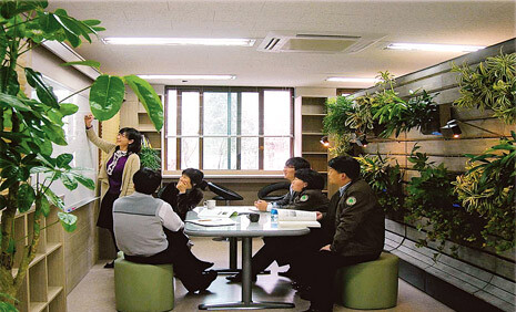 서울시 푸른도시국에서 근무하는 박성대(40)씨는 지난해 시청 본관에서 남산 기슭으로 사무실을 이전한 뒤부터 “숨통이 트이는 기분”이라고 한다. 창문 밖으로 녹지가 보이고 출퇴근 시간에 맑은 공기를 마시니 업무 효율이 배가된다는 것이다. 박씨와 동료들은 지난 1월 창고처럼 방치된 휴게 공간을 싹 바꿨다. 사무실 이전으로 창문 크기가 맞지 않아 쓸모없어진 우드 블라인드를 벽에 붙이고, 비품 교체에 따라 역시 애물단지가 된 회의 탁자에는 테이블보를 입혔다. 식물도 들여놓았다. 그 뒤로는 각종 부서 회의가 이 ‘숲 속 카페’에서 이뤄진다. 박씨는 “외부 손님이 왔을 때 애용하는데, 자리 경쟁이 치열하다”고 너스레를 떨었다.