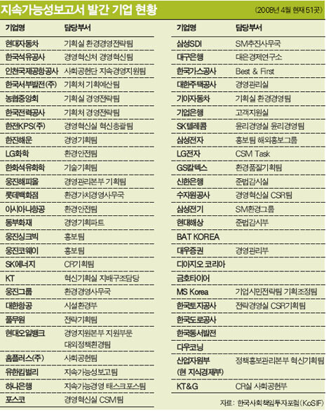 대한상공회의소 지속가능경영원의 3월 말 발표를 보면, 지난해 전세계 2500개 기업이 기업의 경제적·환경적·사회적 성과와 과제를 담은 ‘지속가능성보고서’를 발간했다. 하지만 국내 기업의 참여는 0.9%(23개 기업)에 그쳤다. ‘지속가능성’이란 ESG라는 이니셜로 압축되듯 △환경적(Environment) 노력 △사회적 책임(Social responsibility) △건강한 지배구조(Governance)를 통해 기업의 현재와 미래의 가치를 진단하는 것이다. 기업의 성과와 과제를 공개하고 투자자 및 이해관계자의 반응을 얻어 경영에 반영하는 의사소통 도구의 하나로, 해외 기업설명회(IR)에 필수 자료로 자리잡고 있다. 우리나라에서는 2003년 현대자동차, 삼성SDI, 한화석유화학, 한국다우코닝 등 4개사가 처음 지속가능보고서를 발간한 이래 국가기관(지난해 산업자원부)을 포함해 51곳만 이 보고서를 내고 있다.