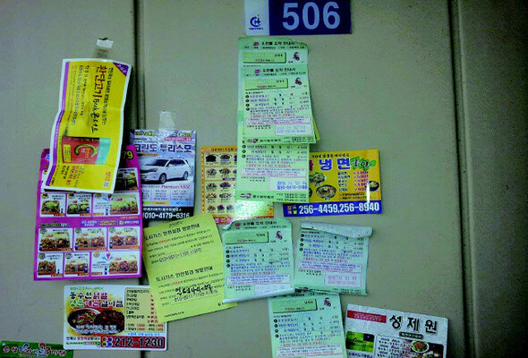 동생이 찍어 보낸 현관문 사진은 빈집을 찾아헤매는 ‘도둑님’의 눈에 번쩍 뜨일 만한 풍경이었다. 재능교육 회사에서 명예훼손과 업무방해로 고소·고발한 사건 재판에 출석하라는 법원 등기 우편물 안내서만 10여장이 붙어 있었다. 쌍용자동차 해고자 복직 범국민대회 건 참가와 관련한 경찰조사 출석 요구서도 한자리를 차지했다. 신장개업한 중국집 홍보 전단지들은 칙칙한 현관문을 알록달록하게 장식하고 있었다.