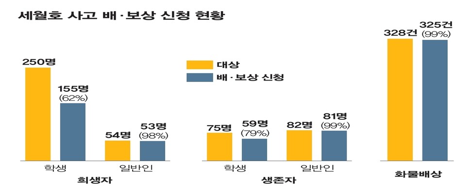 해양수산부는 지난 9월30일 세월호 사고 희생자 유가족과 생존자를 위한 배·보상 신청 접수를 마감했다. 세월호 희생자 304명 중 208명(68%), 생존자 157명 중 140명(89%)이 신청했다. 정부 배·보상을 신청한 208명 가운데 단원고 학생은 155명으로 62%에 그쳤다. 반면 일반인 희생자는 54명 중 53명(98%)이 신청서를 냈다. 생존자의 경우 단원고 학생 75명 가운데 59명, 일반인 82명 가운데 81명이 배·보상을 신청해 각각 79%, 99%의 신청률을 보였다. 결과적으로 일반인 피해자(99%)보다 단원고 학생 피해자(66%)의 배상 신청이 눈에 띄게 적었다.