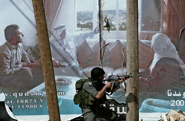 ‘점령의 현실.’ 팔레스타인 땅 요르단강 서안의 헤브론 부근 두라 지역에서 군사작전 중이던 이스라엘 병사가 돌을 던지는 팔레스타인 시위대를 향해 사격 자세를 취하고 있다. 사진 REUTERS/ NAYEF HASHLAMOUN