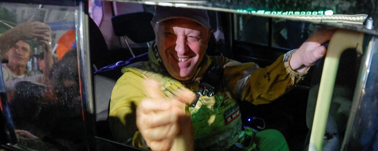 군사반란을 일으킨 민간 군사기업 바그너그룹의 수장인 프리고진이 2023년 6월24일 러시아 남부 로스토프나도누에서 차량에 탄 채 지지자들과 손잡고 있다. REUTERS 연합뉴스