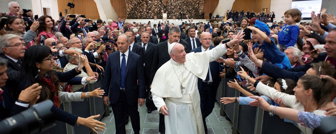 2018년 9월29일 교황 프란치스코가 이탈리아 경찰과 가족을 초대해 마련한 공개청중 행사장으로 들어서며 환호하는 참석자들과 인사를 나누고 있다. REUTERS