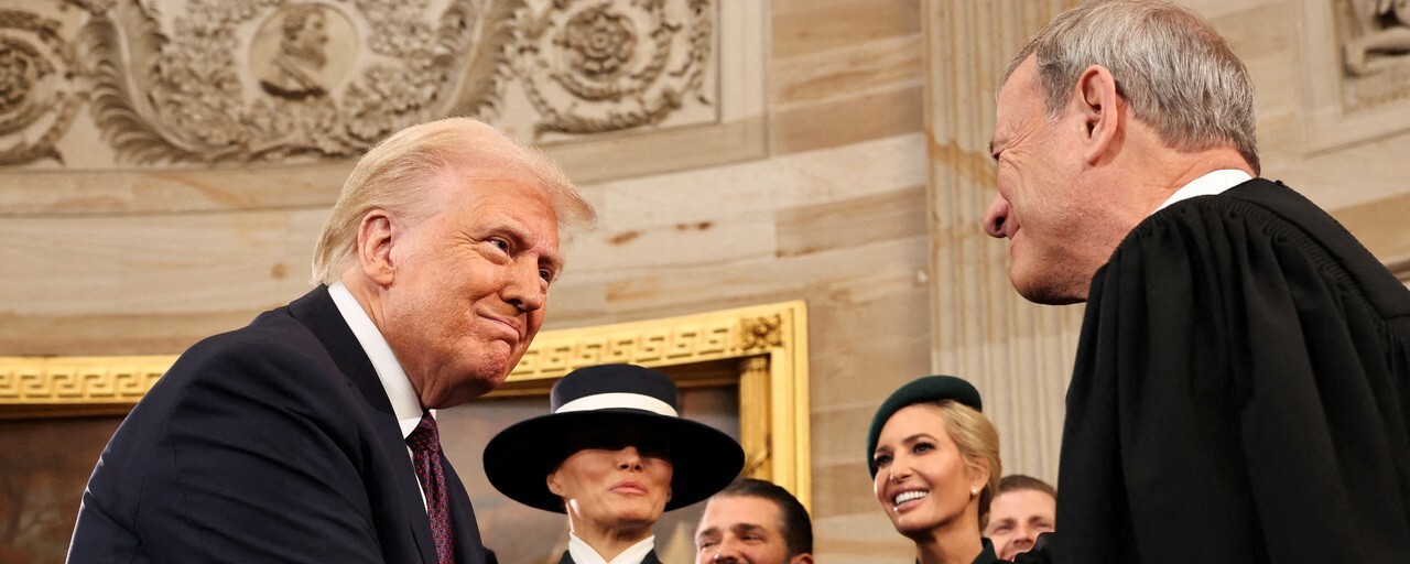 도널드 트럼프 미국 대통령이 2025년 1월20일 연방의회 의사당에서 취임식을 마친 뒤 존 로버츠 대법원장과 악수하고 있다. REUTERS 연합뉴스