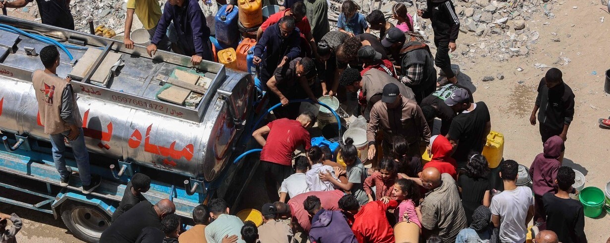 2025년 5월21일 팔레스타인 땅 가자지구 북부 가자시티에서 주민들이 급수차량 주변에 몰려 물을 배급받고 있다. AFP 연합뉴스
