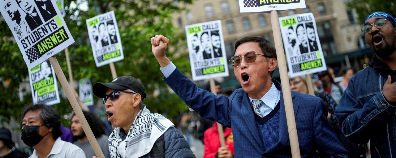 2025년 5월29일 미국 뉴욕에서 컬롬비아대학에 재학 중인 한국인 유학생 정윤서씨의 법정 심리 기간에 연방법원 인근에서 사람들이 집회를 열고 시위를 벌이고 있다. 정윤서는 팔레스타인 지지 시위에 참여한 이유로 체포되었고, 미국을 떠나라는 요구를 받았다. REUTERS