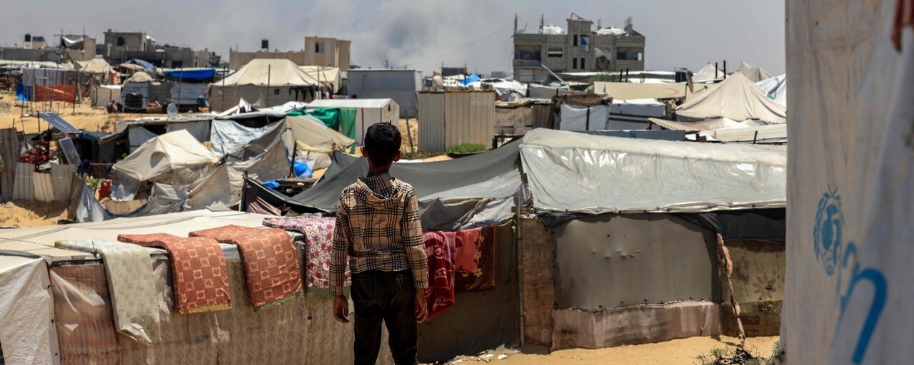 2025년 6월11일 팔레스타인 땅 가자지구 최남단 라파의 피란민촌에서 한 어린이가 이스라엘군 공습으로 뿌연 연기가 피어오르는 모습을 바라보고 있다. AFP 연합뉴스
