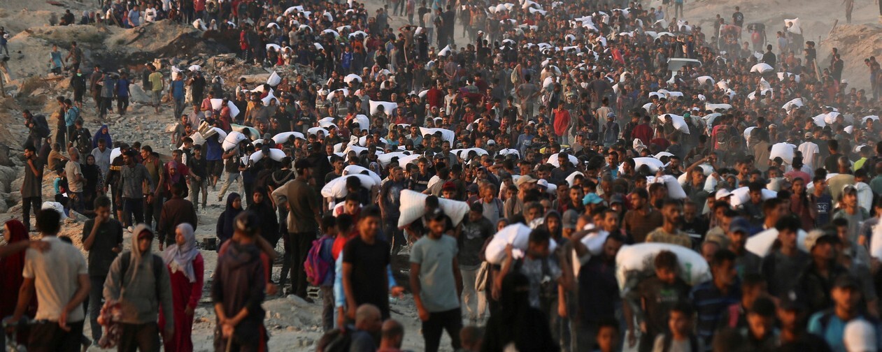 2025년 6월17일 팔레스타인 땅 가자지구 북부 베이트라히야에서 주민들이 밀가루 등 구호품을 배급받아 옮기고 있다. REUTERS 연합뉴스