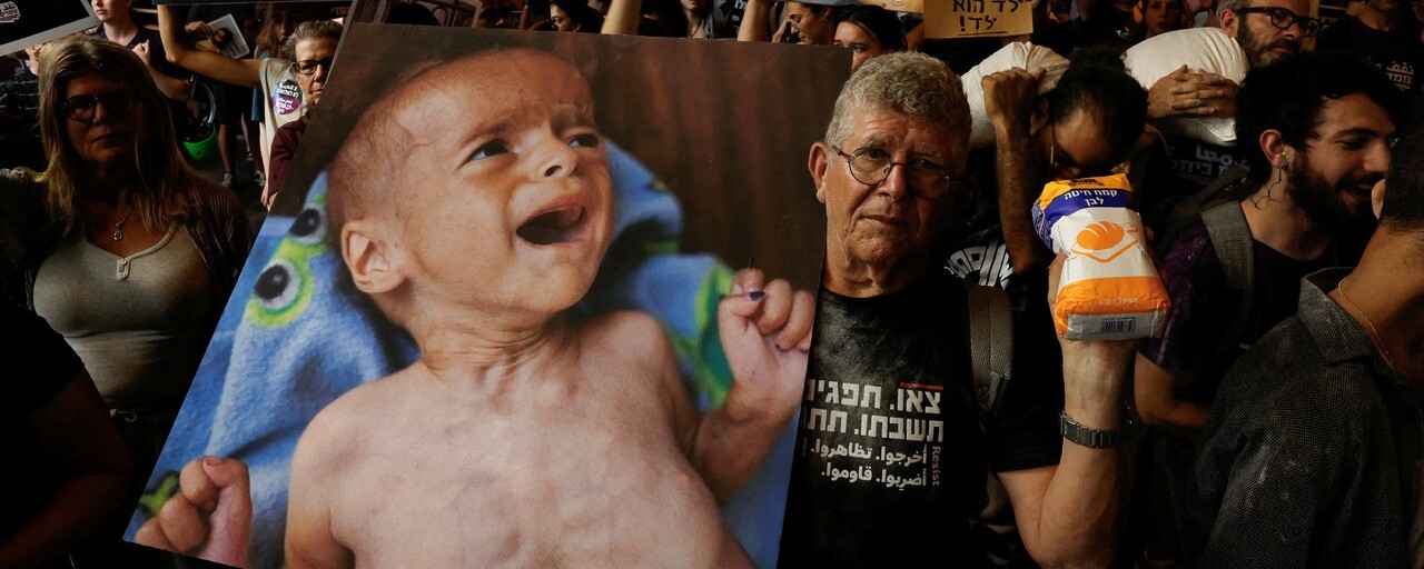 2025년 7월22일 이스라엘 텔아비브에서 열린 반전집회에서 참가자들이 한 손에는 굶주린 팔레스타인 땅 가자지구 어린이 사진을, 다른 손에는 밀가루를 들고 시위를 벌이고 있다. REUTERS 연합뉴스