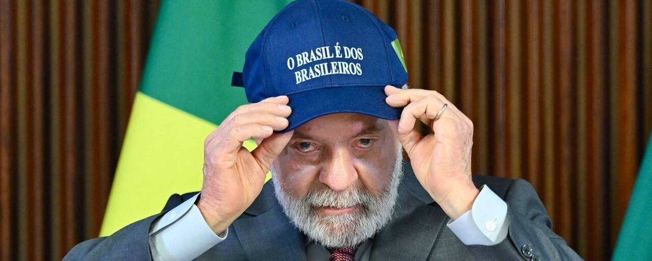 루이스 이나시우 룰라 다시우바 브라질 대통령이 2025년 8월26일 국무회의 개회에 앞서 “브라질은 브라질 국민의 것”이란 문구가 적힌 파란색 모자를 눌러 쓰고 있다. AFP 연합뉴스