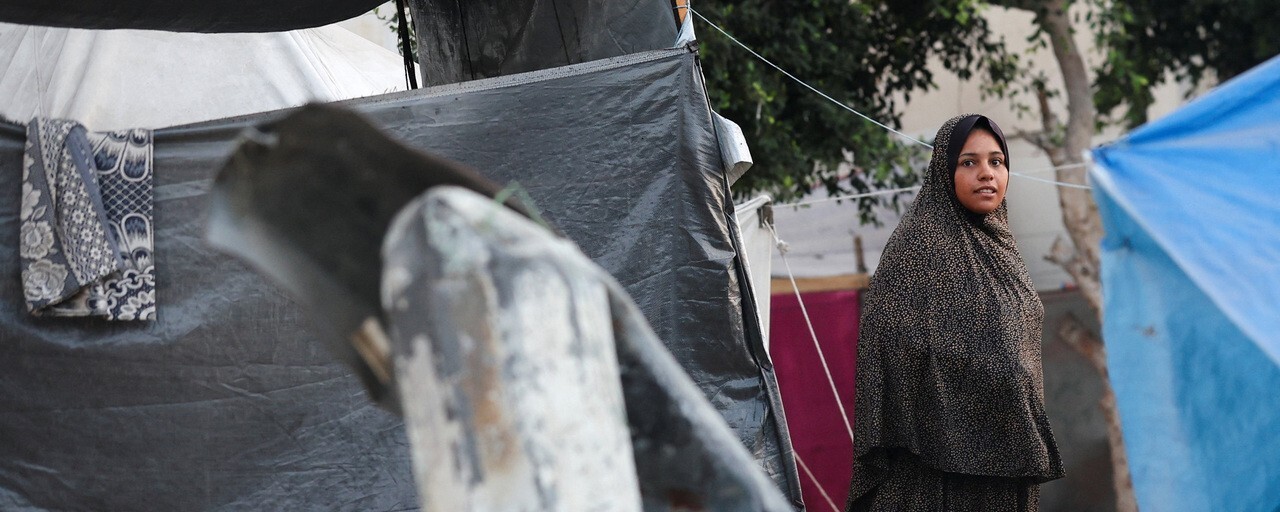 이스라엘과 하마스가 전쟁을 멈추기로 합의했다는 소식이 전해진 직후인 2025년 10월9일 팔레스타인 땅 가자지구 남부 칸유니스의 피란민촌에서 한 여성이 밝은 표정으로 걷고 있다. REUTERS 연합뉴스