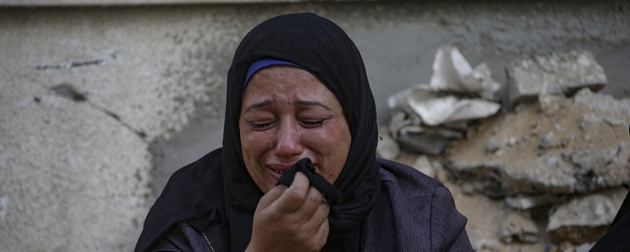 2025년 10월29일 팔레스타인 땅 가자지구 북부 가자시티의 알시파 병원 부근에서 이스라엘군의 공습으로 가족을 잃은 여성이 오열하고 있다. EPA 연합뉴스