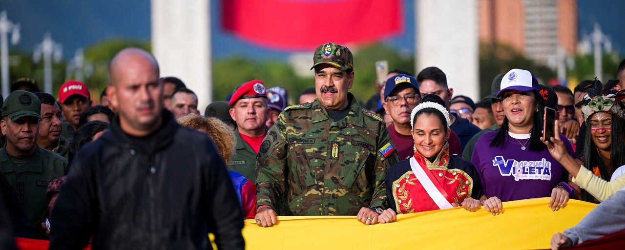 미국의 군사적 위협이 증폭되던 2025년 11월26일 베네수엘라 수도 카라카스에서 열린 집회에서 니콜라스 마두로 대통령(가운데)이 군복 차림으로 행진하고 있다. REUTERS 연합뉴스
