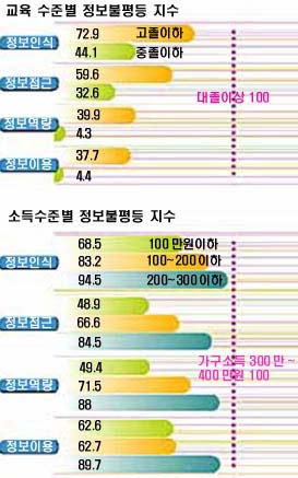 Á¤º¸È°¡ ±Þ¼Óµµ·Î ÁøÇàµÇ¸é¼ Á¤º¸¿¡ ´ëÇÑ Á¢±Ù°ú ÀÌ¿ë µî¿¡¼ÀÇ °ÝÂ÷°¡ ½ÉÈÇϰí ÀÖ´Ù. À̸¥¹Ù ¡®µðÁöÅÐ µð¹ÙÀ̵塯(Digital Divide: Á¤º¸ °ÝÂ÷)¶ó ºÒ¸®´Â Á¤º¸ ºÒÆòµîÀÇ ¹®Á¦´Ù. Á¤º¸ °ÝÂ÷´Â ¹Ì±¹ »ó¹«ºÎ°¡ Áö³ 98³â Á¤º¸È °úÁ¤¿¡¼ ³ªÅ¸³ª´Â Á¤º¸ °ÝÂ÷ ÇØ¼Ò¸¦ À§ÇØ Á¤ºÎ Â÷¿øÀÇ ´ëÃ¥ÀÌ ÇÊ¿äÇÏ´Ù°í ÁöÀûÇÏ¸é¼ Ç¥¸éȵƴÙ. Áö³ÇØ 7¿ù ¹Ì±¹ »ó¹«ºÎ°¡ Æì³½ Á¤º¸ °ÝÂ÷ º¸°í¼¿¡´Â ¹Ì±¹ Àú¼ÒµæÃþÀÇ ÀÎÅÍ³Ý ÀÌ¿ë·üÀÌ °í¼ÒµæÃþÀÇ 20ºÐÀÇ 1¿¡ ºÒ°úÇØ Á¤º¸ °ÝÂ÷°¡ Ä¿Áö°í ÀÖ´Ù°í ºÐ¼®Çسõ°í ÀÖ´Ù. Çѱ¹Á¤º¸¹®È¼¾ÅͰ¡ ¿ÃÇØ 5¿ù¿¡ Á¶»çÇØ »êÃâÇÑ Á¤º¸ ºÒÆòµî Áö¼ö´Â °¡±¸¼Òµæ 100¸¸¿ø ÀÌÇÏÀÇ Àú¼ÒµæÃþ°ú ¿ù¼Òµæ 300¸¸¿ø ÀÌ»óÀÇ °í¼ÒµæÃþ »çÀÌ¿¡ Á¸ÀçÇÏ´Â Á¤º¸ °ÝÂ÷¸¦ º¸¿©ÁÖ°í ÀÖ´Ù. ±³À°¼öÁØ¿¡ µû¸¥ ´ëÁ¹ ÀÌ»ó ÇзÂÀÚ¿Í ÁßÁ¹ ÀÌÇÏ ÇзÂÀÚ »çÀÌÀÇ °ÝÂ÷µµ ½É°¢ÇÏ´Ù(±×¸² ÂüÁ¶). ¹°·Ð ÀÎÅͳÝPC º¸±Þ°ú Ãʰí¼ÓÅë½Å¸ÁÀÇ È®´ë·Î ¡®¾çÀûÀÎ Ãø¸é¡¯¿¡¼´Â °ÝÂ÷°¡ ÁÙ¾îµé°í ÀÖ±â´Â ÇÏ´Ù. ÇöÀç ¿ì¸®³ª¶ó ÄÄÇ»ÅÍ º¸±Þ·üÀº 3°¡±¸ °¡¿îµ¥ 2°¡±¸²Ã. Áö³ÇØ 5¿ù°ú ¿ÃÇØ 5¿ùÀÇ ÀÎÅÍ³Ý ÀÌ¿ë·üÀ» ºñ±³ÇÏ¸é ¿ù¼Òµæ 100¸¸¿ø ÀÌÇÏÀÇ Àú¼ÒµæÃþÀÇ ÀÎÅÍ³Ý ÀÌ¿ë·üÀÌ 8.3%¿¡¼ 3¹è °¡±îÀÌ ´Ã¾î 24.5%¿¡ À̸£·¶´Ù. ÀÌ ±â°£ µ¿¾È ¿ù¼Òµæ 400¸¸¿ø ÀÌ»ó °í¼ÒµæÀÚÀÇ ÀÎÅÍ³Ý ÀÌ¿ë·üÀº 34.1%¿¡¼ 53.4%·Î ´Ã¾ú´Ù. ¾óÇÍ º¸¸é ¼Òµæ¿¡ µû¸¥ Á¤º¸ °ÝÂ÷°¡ »ó´çÈ÷ ÇØ¼ÒµÇ°í ÀÖ´Ù°í º¼ ¼ö ÀÖ´Â °ÍÀÌ´Ù. ±×·¯³ª ¹®Á¦´Â ÄÄÇ»ÅÍ º¸À¯ µî ¾çÀûÀÎ Ãø¸éÀ» ¶Ù¾î³Ñ´Â ÁúÀûÀÎ Ãø¸éÀÌ´Ù. Çѱ¹Àü»ê¿ø Á¶Á¤¹® ¹Ú»ç´Â ¡°ÄÄÇ»Å͸¦ ¾ó¸¶³ª º¸À¯Çϰí, °£´ÜÇÏ°Ô ÀÎÅͳÝÀ» ÀÌ¿ëÇÒ ¼ö ÀÖ´À³Ä´Â Á¤µµ¸¦ ±âÁØÀ¸·Î Á¤º¸ °ÝÂ÷ ¹®Á¦¸¦ º¸´Â ½Ã°¢ÀÌ ÀÖ´Ù¡±¸ç ¡°Á¤º¸¸¦ ¾î¶»°Ô Ȱ¿ëÇϰí, ¾î¶² Á¤º¸¸¦ º¸À¯Çϰí Àִ°¡¸¦ ÇÔ²² ºÁ¾ß ÇÑ´Ù¡±°í ¸»ÇÑ´Ù. ¾ç°ú ÁúÀÇ °£±ØÀº Á÷Àå°ú Çб³¿¡¼ÀÇ ÄÄÇ»ÅÍ ÀÌ¿ë½Ã°£¿¡¼µµ Àß ³ªÅ¸³´Ù. Á÷Àå°ú Çб³¿¡¼´Â ÁßÁ¹ ÀÌÇÏ ÇзÂÀÚ°¡ ´ëÁ¹ À̻󺸴٠ÄÄÇ»ÅÍ ÀÌ¿ë½Ã°£ÀÌ ¿ÀÈ÷·Á 2¹è °¡±îÀÌ ¸¹Àº °ÍÀ¸·Î ³ªÅ¸³ª°í ÀÖ´Ù. ÇзÂÀÌ ³·Àº À̵éÀÌ ÁÖ·Î ´Ü¼ø¾÷¹«Á÷À̳ª ±â¼úÁ÷À¸·Î ÀÏÇϱ⠶§¹®ÀÌ´Ù. ±×·¡¼ ÀÌ¿ë½Ã°£Àº ¸¹Áö¸¸ ÄÄÇ»ÅÍ ÀÌ¿ë´É·Â(Á¤º¸¿ª·®)À̳ª PCÅë½Å ¹× ÀÎÅÍ³Ý »ç¿ë Á¤µµ(Á¤º¸ÀÌ¿ë)¿¡¼´Â ´ëÁ¹ÀÚ¿¡ ºñÇØ 9¹è Á¤µµ³ª ³·Àº °ÍÀ¸·Î Á¶»çµÆ´Ù. Á¤º¸ °ÝÂ÷¿¡¼µµ ÁúÀûÀÎ Â÷À̰¡ Å©°Ô ºÎ°¢µÇ°í ÀÖ´Â °ÍÀÌ´Ù. ÀÎÅÍ³Ý º¥Ã³±â¾÷¿¡¼ ÀÌ·± Â÷ÀÌ´Â °ð ¼ÒµæÀ¸·Î Á÷°áµÈ´Ù. »óǰ °Ë»ö°ú »óǰ °¡°ÝÀ» ºñ±³ÇÏ´Â ÀÎÅÍ³Ý ¾÷ü¿¡¼ ÀÏÇϴ õ¾Æ¹«°³(30)¾¾´Â ¡°ÁÖ¿£Áö´Ï¾î´Â ¿¬ºÀ 3õ¸¸¡4õ¸¸¿øÀ» ¹ÞÁö¸¸ º¸Á¶ ¿£Áö´Ï¾îÀÇ °æ¿ì¿¡´Â 2õ¸¸¿ø ¾ÈÆÆÀ» ¹Þ´Â´Ù¡±¸ç ¡°À¥¸¶½ºÅ͵µ Á¦ÀÛ°ú ±âȹÀÌ ºÐ¸®µÇ¾î ÄÄÇ»Åͳª ÀÎÅͳݿ¡ ±íÀº Áö½ÄÀ» °®°í ÀÖ´Â ±âȹÂÊÀÌ ÈξÀ ÁÁÀº ´ë¿ì¸¦ ¹Þ°í ÀÖ´Ù¡±°í ÀüÇß´Ù. µ¥ÀÌÅͺ£À̽º¸¦ ¾î¶»°Ô ¼³°èÇÏ´ÂÁö, ¾î¶² ½Ã½ºÅÛ ¿î¿µÃ¼°è°¡ ÀûÀýÇÑÁö¸¦ ÈÍÈ÷ ²ç°í ÀÖ´Â »ç¶÷°ú ±×·¸Áö ¸øÇÏ´Â »ç¶÷ »çÀÌ¿¡µµ ¿¬ºÀ¿¡ Å« Â÷À̰¡ ÀÖ´Ù°í µ¡ºÙ¿´´Ù. Á¤º¸ ¿ª·®¿¡ µû¶ó ¼ÒµæÀÌ ´Þ¶óÁö´Â °ÍÀÌ´Ù. ±×·¯³ª ÀÌ·± Â÷ÀÌ´Â ±×³ª¸¶ Á¤º¸È»çȸÀÇ Ã·´ÜÀ» ´Þ¸®´Â »ç¶÷µé »çÀÌ¿¡¼ ÀϾ´Â ÀÏÀÌ´Ù. Àú¼ÒµæÃþÀº Á¤º¸ Á¢±Ù¿¡¼ºÎÅÍ Á¤º¸ÀÇ ºÎÀͺΠºóÀͺó Çö»óÀ» °æÇèÇÑ´Ù. ¹Ú¾Æ¹«°³(14¡¤ÀÎõ½Ã ¤ºÁß3)±ºÀº Áö³ÇØ ¸» ÆæÆ¼¾ö±ÞÀ¸·Î ÄÄÇ»Å͸¦ ¹Ù²Ù°í Ãʰí¼ÓÅë½Å¸ÁÀ» ¼³Ä¡Çß´Ù. ±×´Â ÃÖ±Ù ¿öµåÇÁ·Î¼¼¼ 3±Þ ÀÚ°ÝÁõÀ» ¶¤´Ù. ¹Ú±ºÀº ¡°°íµîÇб³¿¡ ÁøÇÐÇÒ ¶§ °¡»êÁ¡À» ¹Þ±â ¶§¹®¿¡ ¸¹Àº Ä£±¸µéÀÌ ÀÚ°ÝÁõÀ» µû°Å³ª ÀÚ°ÝÁõ ½ÃÇèÀ» ÁغñÇϰí ÀÖ´Ù¡±¸ç ¡°ÀÎÅͳÝÀ» ÅëÇØ ÀڷḦ ã¾Æ°¡¸ç Çб³¿¡¼ ³»ÁØ ¼÷Á¦¸¦ ÇÑ´Ù¡±°í ¸»Çß´Ù. ÃʵîÇб³ 4Çг⠶§ºÎÅÍ 386ÄÄÇ»Å͸¦ »ç¿ëÇØ ÄÄÇ»Å͸¦ ÀÚÀ¯ÀÚÀç·Î ´Ù·é´Ù.