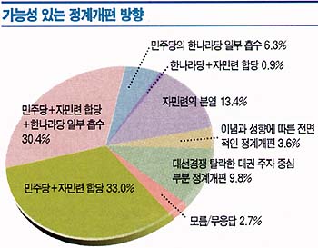 Àüü ÀÀ´äÀÚÀÇ 33.0%ÀÎ 37¸í(ÇÐÀÚ 17¸í + ±âÀÚ 20¸í)Àº ÀÏ´Ü ¡®¹ÎÁÖ´ç°ú ÀڹηÃÀÇ Çմ硯À» ¡°Á¤°è°³ÆíÀÌ ÀÌ·ç¾îÁú °æ¿ì °¡´ÉÇÑ ¹æÇâ 1¼øÀ§¡±·Î ²Å¾Ò´Ù. ±Ù¼ÒÇÑ Â÷ÀÌ·Î ¡®¹ÎÁÖ´ç°ú ÀڹηÃÀÌ ÇÕ´çÇÏ¸é¼ Çѳª¶ó´ç ÀϺμ¼·ÂÀ» Èí¼ö¡¯ÇÏ´Â ¹æ¾È(30.4%)ÀÌ ´ÙÀ½ ¼øÀ§·Î ²ÅÇû°í, ÀڹηÃÀÇ ºÐ¿(13.4%), ´ë¼±°æÀï¿¡¼ Å»¶ôÇÑ ´ë±ÇÁÖÀÚ Áß½ÉÀÇ Á¤°è°³Æí(9.8%) µîÀÌ ±×µÚ¸¦ À̾ú´Ù. ÀÌ ¹Û¿¡ ¼Ò¼ö ÀǰßÀ¸·Î ¹ÎÁÖ´çÀÇ Çѳª¶ó´ç ÀϺΠÈí¼ö(6.3%), À̳伺Çâ¿¡ µû¸¥ Àü¸éÀûÀÎ Á¤°è°³Æí(3.6%), Çѳª¶ó´ç°ú ÀڹηÃÀÇ ÇÕ´ç(0.9%) µîÀÌ ÁöÀûµÆ´Ù. Àü¹®°¡µéÀÇ ÀÌ·± Àü¸ÁÀº ¹ÎÁÖ´çÀÌ 2002³â ´ë¼±À» ¾ÕµÎ°í ÀÌȸâ ÃÑÀç¶ó´Â È®°íÇÑ ´ë±ÇÁÖÀÚ°¡ À̲ô´Â 133¼®ÀÇ °Å´ë¾ß´ç Çѳª¶ó´ç¿¡ ¸Â¼±â À§ÇØ ÀڹηÃÀ» ºñ·ÔÇÑ ´Ù¸¥ ¼¼·Âµé°úÀÇ ¿¬ÇÕ¿¡ ´Ù½Ã Àû±ØÀûÀ¸·Î ³ª¼³ °ÍÀ̶ó´Â Çö½ÇÀû ºÐ¼®¿¡ ±âÃÊÇÑ °ÍÀ¸·Î º¸ÀδÙ. »ç½Ç Àü¹®°¡µéÀÌ Á¤°è°³Æí ½Ã³ª¸®¿À 1¼øÀ§·Î ²ÅÀº ¹ÎÁÖ´ç°ú ÀڹηÃÀÇ ÇÕ´ç¾ÈÀº û¿Í´ë µî ¿©±ÇÇٽɺΰ¡ Áö³ 99³â ¡®DJP °øÁ¶¡¯¶ó´Â ºÒ¾ÈÁ¤ÇÑ °ø»ý°ü°è°ú ¼Ò¼öÁ¤±ÇÀÇ ÇѰ踦 ±Øº¹ÇÏ´Â ´ë¾ÈÀ¸·Î Àû±Ø ÃßÁøÇß°í, JP¿Í »ó´çÇÑ °ø°¨´ë¸¦ Çü¼ºÇß´Ù. ±×·¯³ª ÀÎÀ§Àû Á¤°è°³ÆíÀ» ºñÆÇÇÏ´Â Çѳª¶ó´çÀÇ ÀúÇ×°ú Àڹηà ³» ¸î¸î °°æÆÄ ÀÇ¿øµéÀÇ ¹Ý¹ß¿¡ °¡·Î¸·Çô ¹«»êµÈ ¹Ù ÀÖ´Ù. ±×·¯³ª Àü¹®°¡µéÀº ÀڹηÃÀÌ ±×µ¿¾ÈÀº ¹ÎÁÖ´ç°ú Çѳª¶ó´ç »çÀ̸¦ ¿À°¡¸ç ÁÖ¿ä Çö¾È¿¡ ´ëÇØ ij½ºÆÃº¸Æ®¸¦ Çà»çÇÏ´Â À̸¥¹Ù ¡®ÁÙŸ±â Àü¼ú¡¯À» ÅëÇØ °Ü¿ì »ýÁ¸°ø°£À» È®º¸Çϰí ÀÖÁö¸¸ ´ë¼±ÀÌ ÀÓ¹ÚÇÏ¸é °á±¹ ¡®DJP °øÁ¶¡¯¸¦ ÅëÇØ ¹ÎÁÖ´çÀ» °áÇÕ»ó´ë·Î ¼±ÅÃÇÒ °¡´É¼ºÀÌ ³ô´Ù°í Àü¸ÁÇϰí ÀÖ´Â ¼ÀÀÌ´Ù.