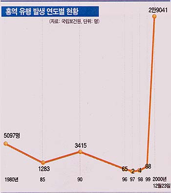 °« 15°³¿ù° Á¢¾îµç ÇØÀÎÀÌ´Ù. ¡°¹«·Á ¿ÀÌ 42µµ³ª µÅ¿ä.¡± ÇØÀÎÀÌ ¾î¸Ó´Ï°¡ ¿ï¸ÔÀδÙ. ÇØÀÎÀÌ ¾Æºüµµ ÀÏÀ» ¸ø ³ª°¡°í ¾ÈŸ±î¿î ´«±æ·Î ÇØÀÎÀÌ °çÀ» Áö۰í ÀÖ´Ù. ¡°¾Ö°¡ ¸»À» ¸øÇؼ ±×·¸Áö ¸¸¾à ¾î¸¥À̶ó¸é ¾Æ¸¶ ¡®³ª Á×¾î ³ª Á׾ ÇÏ°í °®Àº ºñ¸íÀ» Áú·¯´ë¸ç ³¸®°¡ ³µÀ» °Ì´Ï´Ù. ±× Á¤µµ·Î Èûµé°í ¾ÆÇÁÁÒ.¡± ÀÌ º´¿ø ¼Ò¾Æ°ú ÀÌÁø¼ö¾¾ÀÇ ¸»ÀÌ´Ù. À̾¾´Â ¡°ÇØÀÎÀÌ´Â ÀüÇüÀûÀÎ È«¿ªÈ¯ÀÚ¡±¶ó¸ç ¡°È«¿ªÀº Æó·Å, ±â°üÁö¿° µî ¸¹Àº ÇÕº´ÁõÀ» À¯¹ßÇÒ ¼ö Àִµ¥ ÇØÀÎÀ̵µ ÇöÀç ÇÕº´ÁõÀ» ÀÏÀ¸Å°°í ÀÖ´ÂÁö Á¶»çÁß¡±À̶ó°í ¼³¸íÇß´Ù. °°Àº ³¯ ¿ÀÈÄ 10½Ã²² ÀüºÏ ÀüÁֽà ÀüºÏ´ëº´¿ø ¼Ò¾Æº´½Ç. À̳¯µµ È«¿ªÈ¯ÀÚ°¡ µÎ¸íÀ̳ª »õ·Î ÀÔ¿øÇß´Ù. 13°³¿ùÀÇ ¼ö¿¬ÀÌ¿Í 14°³¿ù°ÀÎ ÇöÁøÀÌ´Ù. ¼ö¿¬ÀÌ´Â ¿Ü·¡¿¡¼ ÀÌÆ² µ¿¾È Åë¿øÄ¡·á¸¦ ¹Þ´Ù ÀÔ¿øÇß°í, ÇöÁøÀÌ´Â ÀÏ¹Ý ÀÇ¿ø¿¡ ´Ù´Ï´Ù °á±¹ ÀÌ º´¿øÀ¸·Î ¿Ô´Ù. À̵éÀº °°Àº º´½Ç¿¡ ³ª¶õÈ÷ ´©¿ö ÀÖ¾ú´Âµ¥, ¼ö¿¬ÀÌ´Â ¿Â¸ö¿¡ ¹ßÁøÀÌ ³ª °Ñº¸±â¿¡µµ È«¿ªÈ¯ÀÚÀÓÀ» ´Ü¹Ú¿¡ ¾Ë ¼ö ÀÖ¾ú´Ù. ¼ö¿¬ÀÌ ¾î¸Ó´Ï´Â ¡°Ã³À½¿¡ °¨±â¿¡ °É·Á ÇÑ´Þ µ¿¾È °¡±î¿î º´¿ø¿¡¼ Ä¡·á¸¦ ¹Þ´Ù°¡ °©ÀÚ±â ÁßÀÌ¿°ÀÌ »ý±â¸é¼ È«¿ªÀ» ¾Î¾Ò´Ù¡±°í ¸»Çß´Ù. ±×´Â ¡°¾Æ¹«·¡µµ °¨±âÄ¡·áÂ÷ º´¿ø¿¡ ´Ù´Ï´ø Áß È«¿ª¿¡ °¨¿°µÈ °Ô ¾Æ´Ñ°¡ ½Í´Ù¡±°í µ¡ºÙ¿´´Ù. º´Ä¡·á ÇÏ·¯ °¡´Ù µÇ·¹ º´À» ¾òÀº °ÍÀÌ´Ù. ÇöÁøÀÌ´Â ¸· È«¿ª¿¡ °¨¿°µÈ µíÇÏ´Ù. ¾ÆÁ÷ ¹ßÁøÀº Å©°Ô ¾øÁö¸¸ ¸Å¿ì °íÅ뽺·¯¿öÇÏ¸ç ¼ûÀ» Çæ¶±ÀδÙ. Áö³ÇØ ÀüºÏ´ëº´¿ø¿¡¼ ÀÔ¿øÄ¡·á¸¦ ¹ÞÀº È«¿ªÈ¯ÀÚ´Â 12¿ù26ÀϱîÁö ¸ðµÎ ¹«·Á 281¸í. ¿µµ¿¼¼ºê¶õ½ºº´¿øµµ 99³â¿¡´Â ÇÑ¸íµµ ¾ø¾ú´ø µ¥ ºñÇØ Áö³ÇØ 12¿ù5ÀÏ ÇöÀç 62¸í¿¡ À̸£·¶´Ù. ÀüºÏ´ëº´¿ø¿¡´Â ¾ó¸¶ Àü »ê¸ð±îÁö È«¿ª¿¡ °É·Á ÀÇ·áÁøÀ» ±äÀå½ÃÄ״µ¥ ´ÙÇàÈ÷ žƴ °¨¿°µÇÁö ¾Ê¾Ò´Ù°í ÇÑ´Ù. ÇѶ§ ¸¶¸¶(õ¿¬µÎ)¿Í ´õºÒ¾î ¾ÆÀ̵éÀÇ »ý¸ñ¼ûÀ» ¾Ñ¾Æ°¡´Â ¹«¼¿î Àü¿°º´À¸·Î ¾Ç¸íÀ» ¶³Ä£ È«¿ª(ûõæ¹). ÀÌ º´Àº Áö³ 1960³â´ë ¹Ì±¹ µî ¼±Áø±¹¿¡¼ ¿¹¹æ¹é½ÅÀÌ °³¹ß¡¤º¸±ÞµÇ¸é¼ ´õÀÌ»ó ¼¼°è ¾î¸°À̵鿡°Ô ¡®ÃµÇüÀÇ Åë°úÀÇ·Ê¡¯°¡ ¾Æ´Ï°Ô µÆ´Ù. ±¹³»¿¡¼µµ ¿¹¹æÁ¢Á¾ÀÌ ½Ç½ÃµÇ¸é¼ ȯÀÚ°¡ ¶Ñ·ÇÇÑ °¨¼ÒÃß¼¼¸¦ º¸¿´´Ù. 95³â 71¸í, 96³â 65¸í, 97¸í 2¸í, 98³â 4¸í, 99³â 88¸íÀ¸·Î 90³â´ë ÈÄ¹Ý µé¾î ÀÌÁ¦ È«¿ªÀº »ç¶óÁö·Á³ª ½Í¾ú´Ù. ±×·±µ¥ °©ÀÚ±â ÀÌ ¶¥¿¡ È«¿ª´ë¶õÀÌ ÀϾ´Ù. Áö³ÇØ 1¿ù¿¡ 1¸í¿¡¼ ½ÃÀÛÇÑ È«¿ª¹Ù¶÷Àº 2¿ù 2¸í, 3¿ù 7¸íÀ¸·Î ´ÞÀÌ ¹Ù²î¸é¼ Á¶±Ý¾¿ ´Ã¾î³ª´õ´Ï 4¿ù¿¡ 330¸í, 6¿ù 875¸íÀ¸·Î ²±Ãæ ¶Ù¾î º¸°Ç´ç±¹À» ±äÀå½ÃÄ×´Ù. 9¿ù µé¾î 394¸íÀ¸·Î Á¶±Ý ÁÙ¾îµç µíÇÏ´ø È«¿ªÈ¯ÀÚ´Â 10¿ù¿¡ 2063¸íÀ¸·Î ´Ù½Ã Å©°Ô ´Ã¾î³µ´Ù. ±×·¯´Ù 11¿ù µé¾î¼´Â ¸¶Ä¡ »êºÒó·³ °ÈÀâÀ» ¼ö ¾øÀÌ ¹øÁö±â ½ÃÀÛ, ÇÏ·ç¿¡ 500¸í¾¿ ȯÀÚ°¡ ¼ÓÃâÇØ ¼ø½Ä°£¿¡ 1¸¸1591¸í¿¡ À̸£·¶´Ù. ±× ¼Óµµ´Â Á»Ã³·³ ¼ö±×·¯µéÁö ¾Ê¾Æ 12¿ù¿¡µµ ¿©ÀüÈ÷ 1¸¸¸íÀ» ³Ñ¾î¼°í ÀÖ´Ù. 12¿ù23ÀÏ ÇöÀç ±¹¸³º¸°Ç¿ø¿¡ Á¢¼öµÈ °ø½ÄÅë°è¿¡ µû¸£¸é È«¿ªÈ¯ÀÚ ¼ö´Â 2¸¸9041¸í. 2000³â ÃÖÁ¾ Áý°è´Â ¾Æ¹«·¡µµ 3¸¸¸íÀ» ³Ñ¾î¼³ °Í °°´Ù. 99³â(88¸í)¿¡ ºñÇØ ¹«·Á 24000% ÆøÁõÇÑ ¼öÄ¡ÀÌ´Ù. ÇÏÁö¸¸ ÀÌ ¼öÄ¡´Â ¾îµð±îÁö³ª º¸°Ç¼Ò¿¡ Á¢¼öµÈ °ø½ÄÁý°è¿¡ ºÒ°úÇÏ´Ù. ÃʱâÁõ»óÀÌ °¨±â¿Í À¯»çÇÑ ¸¸Å Àϼ± ÀÇ¿ø¿¡¼ ½Å°í ¾È ÇÑ ¼ýÀÚ±îÁö ÇÕÄ¡¸é ½ÇÁ¦ È«¿ªÈ¯ÀÚ´Â Àû¾îµµ 5¸¸¸íÀ» Èǽ ³Ñ¾úÀ¸¸®¶ó´Â °Ô Àü¹®°¡µéÀÇ Ãß»êÀÌ´Ù.
