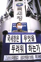À± ȸ°è»ç´Â 11¿ù22ÀϺÎÅÍ Âü¿©¿¬´ëÀÇ ¡®Á·¹ú¼¼½À ½ÉÆÇÀ» À§ÇÑ ½Ã¹ÎÇൿ¡¯ »çÀÌÆ®(peoplepower21.org/samsung)¿Í ÀÎÅͳݽŹ® <¿À¸¶ÀÌ´º½º>(www.ohmynews.com)¸¦ ÅëÇØ ±¹¼¼Ã»Àå¿¡°Ô 8ÅëÀÇ ¾ÖƶÇÑ(?) ÆíÁö¸¦ º¸³Â´Ù. ¹Ù·Î »ï¼º À̰ÇÈñ ȸÀåÀÇ Àå³² ÀÌÀç¿ë(32)¾¾ÀÇ Å»¼¼ÀÇȤ Á¶»ç¸¦ Ã˱¸ÇÏ´Â ÆíÁö¿´´Ù. ±×·¯³ª ±¹¼¼Ã»ÀåÀ¸·ÎºÎÅÍ ¾Æ¹«·± ÀÀ´äÀÌ ¾øÀÚ 12¿ù ù¶ÁÖ ¿ù¿äÀϺÎÅÍ´Â ¾Æ¿¹ ±¹¼¼Ã» ¾Õ¿¡¼ ÁøÀ» Ä¡°Ô µÈ °ÍÀÌ´Ù. ¡°±¹¼¼Ã»ÀåÀº ħ¹¬Çϰí ÀÖÁö¸¸ ¾ç½ÄÀÖ´Â ¼¼¹«°ø¹«¿øµéÀÇ ÀÚ¼ºÀÌ ºÐÀ§±â¸¦ ¹Ù²Ü ¼ö ÀÖÀ» °ÍÀ¸·Î ±â´ëÇÕ´Ï´Ù. ±×·¡¼ »ï¼ºÀÇ º¯Ä¢Áõ¿©¿¡ ´ëÇÑ °ú¼¼¿Í Á¶¼¼Á¤ÀǸ¦ ¿¸ÁÇÏ´Â ±¹¹ÎµéÀÇ ¸ñ¼Ò¸®¸¦ ±×´ë·Î Àü´ÞÇϱâ À§ÇØ ¸ÅÀÏ Ãâ±Ù½Ã°£¿¡ ¸ÂÃç ½ÃÀ§¸¦ ½ÃÀÛÇÏ°Ô µÆ½À´Ï´Ù.¡± À± ȸ°è»ç´Â ¸¶½ºÅ©¸¦ ¾²°í ÀÖÁö¸¸ ±×ÀÇ ¿À´ÞÁø ÀλóÀ» ±Ý¹æ ¾Ë¾Æº¸°í °ÉÀ½À» ¸ØÃß´Â À̵éÀÌ ¸¹´Ù. ÇÏÁö¸¸ À± ȸ°è»ç´Â »ï»ï¿À¿À ¸ðÀÌÁö ¾Êµµ·Ï ½º½º·Î °æ°èÇÑ´Ù. »ï¼ºÀÌ ±³¹¦ÇÏ°Ô ÀÌ ºôµù¿¡ Áö³ 6¿ù ¿ÂµÎ¶ó½º ´ë»ç°üÀ» À¯Ä¡ÇØ ¹Ý°æ 100m À̳»¿¡¼´Â Áýȸ¸¦ ÇÒ ¼ö ¾ø´Ù°í Çϱ⠶§¹®ÀÌ´Ù. »ç¶÷µéÀÌ ¸ðÀÌ´õ¶óµµ À± ȸ°è»ç´Â ÇѸ¶µðµµ ÇÒ ¼ö ¾ø´Ù. ¼±µ¿À̶ó¸é ¹ä¸Ô±âº¸´Ù ´õ Áñ°Ì°í ½¬¿î ±×·Î¼´Â ´ä´äÇÑ ³ë¸©ÀÌÁö¸¸ ÇѸ¶µð¶óµµ Å©°Ô ¶°µé¸é ¹ü¹ýÀÚ·Î ¸ô¸± ¼ö Àֱ⠶§¹®ÀÌ´Ù. À±Á¾ÈÆ È¸°è»ç´Â Áö±Ý ȸ°è»ç·Î¼ ¹äÁÙÀÌ °ÅÀÇ ²÷°å´Ù. Çϱâ¾ß ¿ì¸®³ª¶ó¿¡¼ °¡Àå ÈûÀÌ ¼¼´Ù´Â ±¹¼¼Ã»°ú »ï¼ºÀ» »ó´ë·Î ÇÑÆÇ ´ë°áÀ» ÀÚûÇÑ ¸¶´ç¿¡ ¹äÁÙÀÌ ¿ÂÀüÇÒ °ÍÀ̶ó°í ±â´ëÇßÀ» ¸®°¡ ¾ø´Ù. ±×´Â óÀ½ºÎÅÍ ¡®¹è°íÇ ±æ¡¯À» ¼±ÅÃÇß´Ù. ´ëÇÐ(¿¬¼¼´ë °æÁ¦Çаú 80Çйø)¿¡ µé¾î°¡ ¡®¾îµÎ¿î Á×À½ÀÇ ½Ã´ë¡¯¸¦ ¿Â¸öÀ¸·Î ¶Õ¾îº¸·Á´Ù °Á¦Â¡ÁýÀ» ´çÇß°í, Á¦´ë µÚ¿¡µµ 4³â¿© µ¿¾È ÅýÃÁ¤ºñ°ø°ú Åýñâ»ç·Î ³ëµ¿ÇöÀå¿¡ Åõ½ÅÇϱ⵵ Çß´Ù. ÇöÀåÀÇ °æÇèÀ» °¡½¿¿¡ ¹¯¾îµÎ°í 90³â ȸ°è»ç°¡ µÈ µÚ, ±×´Â ±¹³» ÃÖ´ë ȸ°è¹ýÀÎÀÎ »êµ¿È¸°è¹ýÀΰú »ïÀÏȸ°è¹ýÀο¡¼ ÀÏÇϸç ÇѶ§ ¡®Àß ³ª°¡´Â ȸ°è»ç¡¯°¡ µÈ Àûµµ ÀÖ¾ú´Ù. ÇÏÁö¸¸ ȸ°èºÐ½Ä°ú Å»¼¼ÀÚ·á ²Ù¸çÁֱ⸦ ¼½¿Áö ¾Ê´Â »ýȰÀ» µµÀúÈ÷ °ßµô ¼ö ¾ø¾î ȸ°è¹ýÀÎÀ» ¹ÚÂ÷°í ³ª¿Â µÚ 94³â¿¡ °³¾÷À» Çß´Ù. ±×´Â °³¾÷ ÀÌÈÄ¿¡µµ ¡°°Å·¡Ã³·ÎºÎÅÍ Á¢´ë¸¦ ¹Þ°í ÇãÀ§ÀåºÎ¸¦ ´ëÃæ ´«°¨¾ÆÁÖ°í °í°´¿¡°Ô Å»¼¼Áöµµ¸¦ ÇØÁֱ⵵ ÇÑ ¡®ÀÚº»ÁÖÀÇ °³¡¯·Î¼ Àû´çÈ÷ Áñ±â¸ç ½Ã°£À» ³¶ºñÇß´Ù¡±°í °í¹éÇÑ´Ù. ±×·¯´Ù°¡ 96³â ¿©¸§ Âü¿©¿¬´ë¿¡ °¡ÀÔÇÏ¸é¼ ¡®°¡½¿¿¡ ¹¯¾îµÐ Áü¡¯À» ½Å³ª°Ô Ç®±â ½ÃÀÛÇß´Ù. ¡°¾Æ´Â º¯È£»ç°¡ ¡®ÁÁÀº »ç¶÷µé ¸¹´Ù¡¯±â¿¡ ¾Æ¹« »ý°¢¾øÀÌ Âü¿©¿¬´ë¿¡ ¶Ù¾îµé°Ô µÇ¾ú´Âµ¥ À̶§ºÎÅÍ »ý°è´Â ¾î·Á¿öÁ³Áö¸¸ »çȸ´Â ´Ù½Ã Á¶±Ý¾¿ º¸À̱⠽ÃÀÛÇß½À´Ï´Ù. Á¶¼¼ÆÀÀ» ±¸¼ºÇØ È°µ¿À» ÇÏ¸é¼ °í¼Òµæ Àü¹®Á÷¿¡ ´ëÇÑ ºÎ°¡°¡Ä¡¼¼ ¸é¼¼ÇýÅà ÆóÁö¿Í ÀÚ¿µ¾÷ÀÚ¿¡ ´ëÇÑ °ú¼¼Æ¯·ÊÁ¦ ÆóÁö, ±ÝÀ¶Á¾ÇÕ°ú¼¼ Àç½ÃÇà µî ¿ì¸®°¡ ÁÖÀåÇß´ø ¼¼Á¦°³Çõ¾ÈÀÌ °üöµÉ ¶§¸¶´Ù Å« º¸¶÷À» ´À²¼½À´Ï´Ù. ±×·±µ¥ »ç½Ç°ü°è°¡ ¸íÈ®ÇÑ »ï¼ºÀÇ º¯Ä¢Áõ¿©°Ç¿¡ ´ëÇØ¼´Â ±¹°¡±Ç·ÂÀÌ ±×´ë·Î ¹æÄ¡Çϰí ÀÖ´Â µ¥ ´ëÇØ ºÐ³ë¸¦ ³Ñ¾î ¼±ÛÇıîÁö ´À³§´Ï´Ù.¡±
